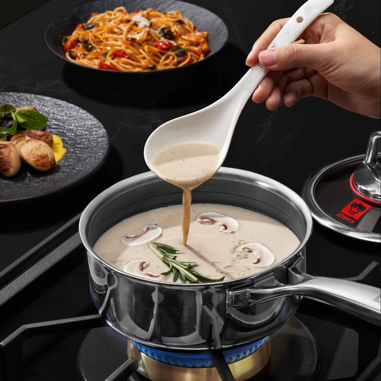 - Die abgerundete Form eignet sich hervorragend zum Verquirlen größerer Soßenmengen.