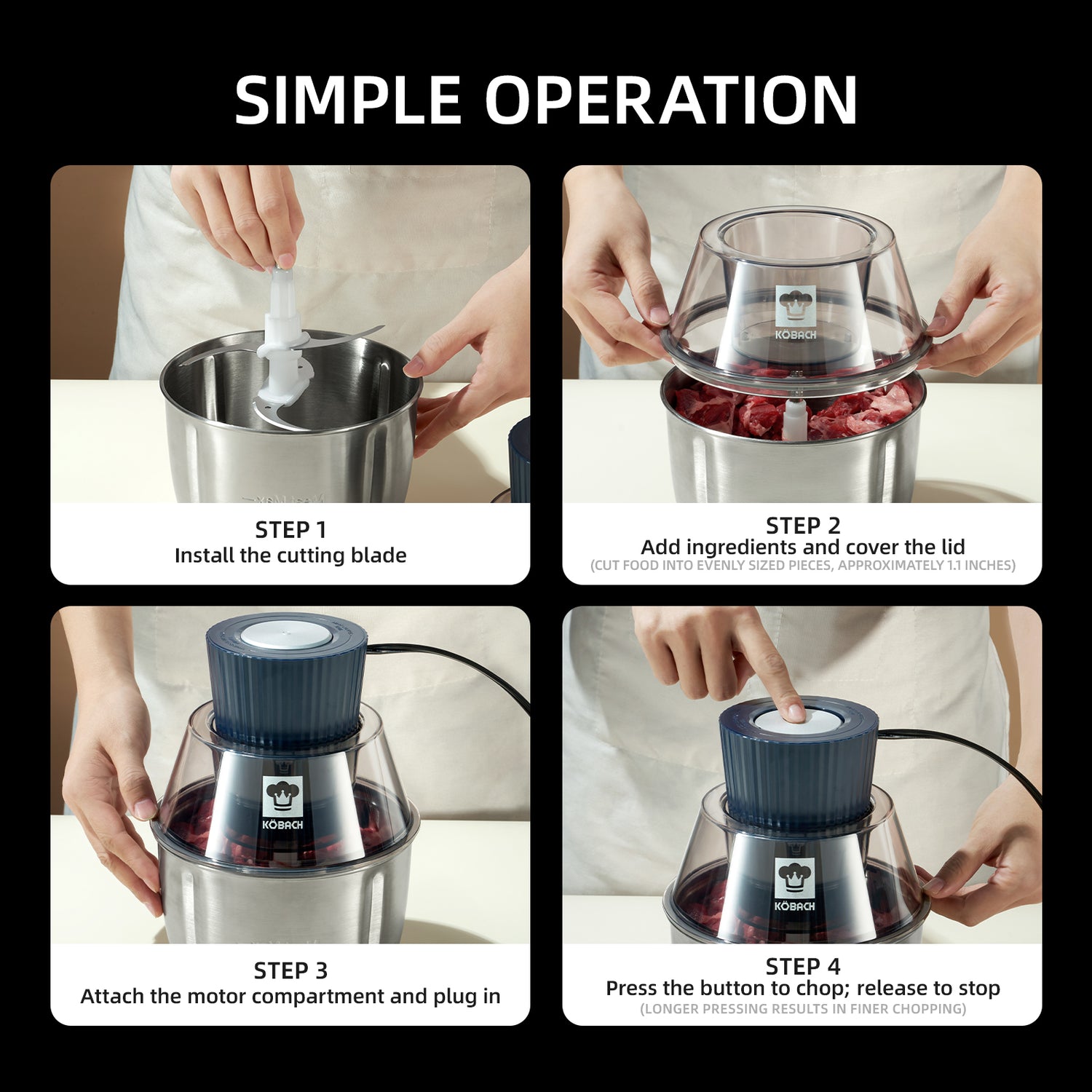 • 【Make Cooking Fun】KOBACH electric meat chopper features a robust motor and double-layer stainless steel blades for high-speed performance. Electric Meat Grinder starts with just a light press. It chops, mixes, stirs, whips, grinds, and makes vegetable salads, applesauce, peanut butter, and more. No more hassle with chopping onions or meat – with the KOBACH Electric Meat Grinder, cooking becomes a fun and easy experience.